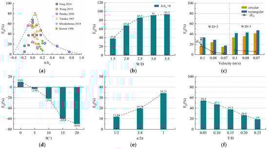 Various relationships between scour reduction efficiency and the factors of the collar. Data were sourced from references [,,,,,,,,]. (a) Installation height [,,,,,]; (b) size []; (c) shape []; (d) tilt angle []; (e) protection range []; (f) thickness [].