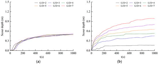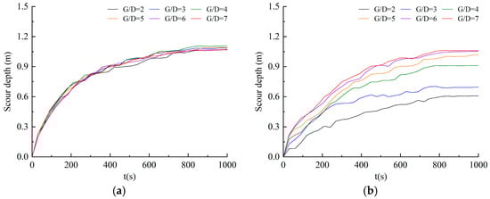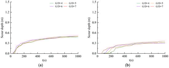 Figure 9 shows the development of local scour depth around the bridge piers over time for group A. The development of local scour depths around the upstream piers and the maximum scour depths were close in the six cases exhibiting different spacing (G/D = 2–7). However, the development rate and the maximum scour depths around the downstream piers were increased with the increase in pier spacing. The larger the spacing was, the faster the development rate and the deeper the maximum scour depth was.