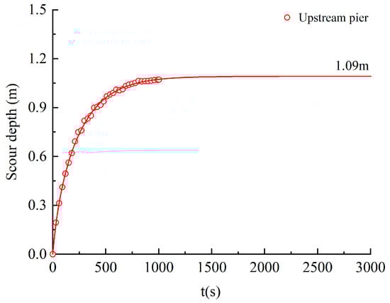 The development of the scour depth of the upstream pier in the cases was close; therefore, the data in case A6 (G/D = 7) were used for the fitting analysis. The results of the fitting analysis are shown in Figure 10. The parameters of the fitted curve are shown in Table 2. In Figure 10, the data matched the curve well, and the correlation coefficient was as close as 0.99899. When the fitting time was extended to 3000 s, the depth of the local scour was stable, which means that the local scour had reached a stage of scour equilibrium with the maximum scour depth of 1.09 m. Within the simulation length of t = 1000 s, the maximum scour depth was 1.06 m, which is more than 97% of that in the stage of scour equilibrium. Therefore, the length of simulation time set in this study is reasonable. Because of the sheltering effect of the upstream pier, the development of the local scour depth around the downstream pier could not fit Equation (15). It is difficult to check whether the local scour of the downstream pier was stabilized or not when using the method above. However, the method of directly observing the scour depth can be used to check the scour status. In Figure 9b, the local scour depth around the downstream pier developed quickly in the first 20 s. Then, it slowed down gradually within 800 s and became stable at 800 s. The development of the local scour depth around the downstream pier was similar to that of the upstream pier. It could, thus, be suggested that the development of local scour around the downstream pier had also reached a stage of scour equilibrium.