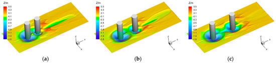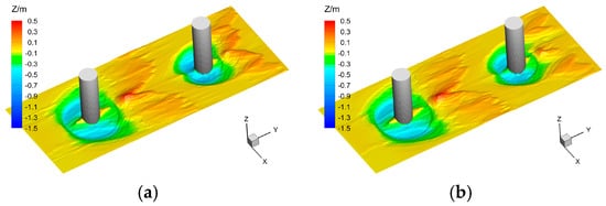 Table 8 shows the maximum scour depth around the piers with different sizes of collars. Figure 20 shows the morphology of the scour pit around the piers. In Table 8 and Figure 20, the local scour on both sides of the downstream pier moved from the edge of the collar to the pier when the size of the downstream collar was reduced. The smaller the collar was, the deeper the local scour was. The reason for this is that even a smaller downstream collar can effectively resist the scouring of the riverbed caused by the downstream flow in front of the pier. However, the protective effect on the two sides of the high-speed bypass flow is not so obvious with a smaller collar. Therefore, local scouring behavior can develop easily from the edge of the collar to the edge of the pier.