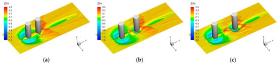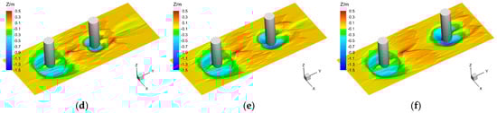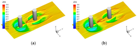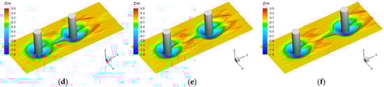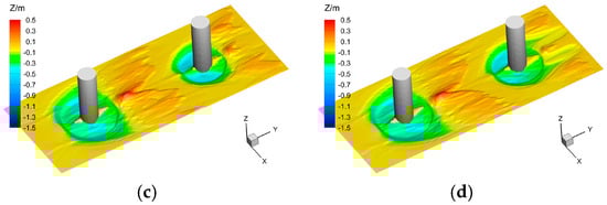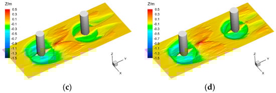 Table 3 shows the maximum scour depth around the pier when applying different spacings. Figure 11 shows the local scour pit morphology around the pier. It can be seen from Table 3 and Figure 11 that when the spacing between piers was smaller than 4.0D, the upstream pier had a significant “sheltering” effect. In the meantime, the local scour depth and range around the downstream pier were significantly smaller than that of the upstream pier. The upstream pier played a similar role as a sacrificial pile, which helped reduce the local scour around the downstream pier. With the increase in pier spacing, G/D, the local scour depth around the downstream pier increased, and the “sheltering” effect of the upstream pier was gradually weakened. When G/D = 5, the maximum local scour depth around the downstream pier was 1.02 m, which had reached 93.5% of that of the upstream pier. When G/D > 5, the local scour depth and scour pit morphology of the downstream pier and the upstream pier were the same.