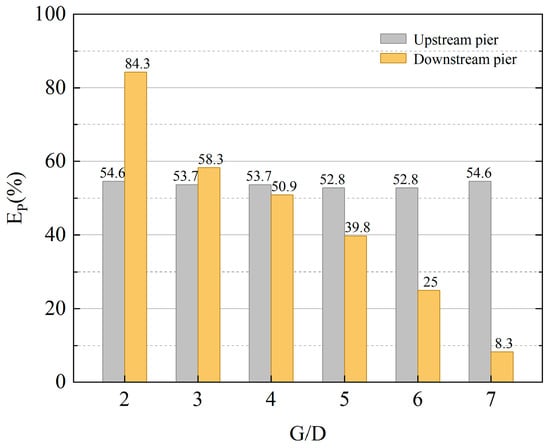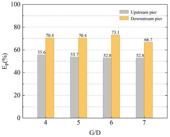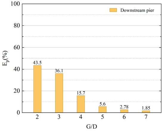 To quantitatively evaluate the “sheltering” effect of the upstream pier on the downstream pier, the local scour reduction efficiency of the downstream pier was calculated via Equation (14) and is shown in Figure 12. The dmax value was the maximum scour depth around a single pier without a collar. According to the conclusions of Wang et al. [], the form and depth of the scour pits formed around the upstream pier with different pier spacing were almost the same as those formed around a single pier. Therefore, the maximum local scour depth around the upstream pier can be considered as dmax. The dmax value was 1.08 m, which was the mean value of the maximum local scour depth of the upstream piers of Group A. In Figure 12, the scour reduction efficiency of the downstream pier decreased continuously with the increase in the pier spacing G/D. When G/D < 3, the maximum scour reduction efficiency, Ep, could reach 43.5%. When G/D = 5, the scour reduction efficiency decreased rapidly to 5.6%. When G/D > 5, the scour reduction efficiency was lower than 3.0%, the “sheltering” effect of the upstream pier almost disappeared, and the local scour characteristics of the upstream and downstream piers were similar to that for a single pier.