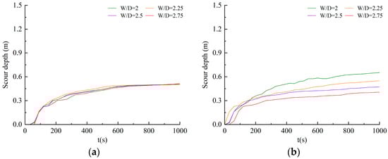 Figure 19 shows the variation of scour depths around the upstream and downstream piers in Group D with time. As shown in Figure 19, the change in the size of the downstream collar did not have a significant effect on the developmental characteristics of the maximum local scour depth around the upstream pier. Figure 19b and Figure 16b show that: (1) the development of the local scour depth around the downstream pier was accelerated after the size of the downstream collar was reduced, especially when W/D = 2.0. (2) The maximum local scour depth around the downstream pier increased significantly, indicating that the collar size significantly affected the local scour depth and the development characteristics.