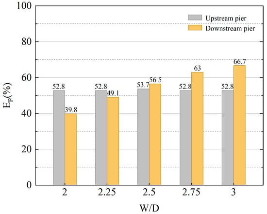Figure 21 shows the local scour reduction efficiency of the upstream pier and downstream pier in Group D and for case C4. In Figure 21, the scour reduction efficiency of the downstream pier decreased from 66.7% (W/D = 3) to 39.8% (W/D = 2) with a reduction in the downstream collar size. In Table 8 and Figure 21, when the size of the downstream collar was 2.25D, the local scour depth of the downstream pier was close to that of the upstream pier. Therefore, if the local scour depth around the upstream pier with a collar is considered to be safe and acceptable, it is recommended that the downstream collar size should be larger than 2.25D (W/D ≥ 2.25).