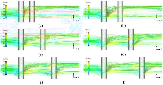 Streamlines around the upstream and downstream piers (Group A). (a) G/D = 2; (b) G/D = 3; (c) G/D = 4; (d) G/D = 5; (e) G/D = 6; (f) G/D = 7.