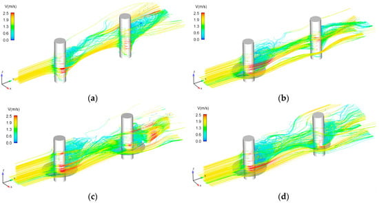 Three-dimensional streamlines around the pier. (a) A6; (b) B6; (c) C4; (d) D1.