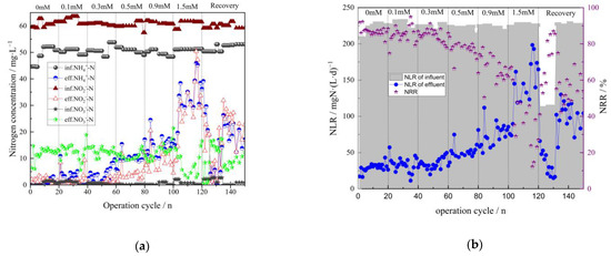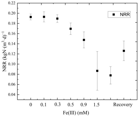 - The effects of Fe (III) content (ranging from 0 to 1.5 mM) on the anammox biofilm process were studied. Results indicated that the average NRR slightly increased at a low concentration of Fe (III) (lower than 0.1 mM). With the addition of Fe (III) doses ranging from 0.3 mM to 1.5 mM, the average TNRE declined from 86.9% to a minimum of 38.3%, indicating severe inhibition of anammox at high levels of Fe (III). Nevertheless, when adding EDTA·2Na to the reactor, the TNRR in the system gradually restored to 0.126 kgN·(m3·d)−1, and the TNRE maintained at about 60%, indicating that the anammox bacteria’s activity could be recovered. Additionally, the anammox bacteria exhibited a strong ability to resist the continuous loading of Fe (III).