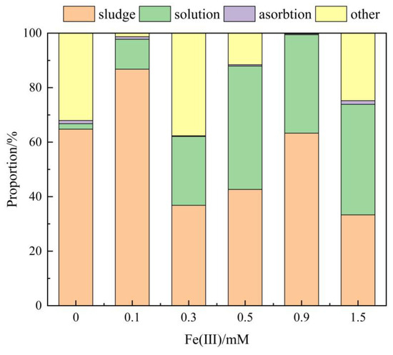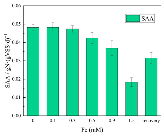 - Under exposure to elevated Fe (III), a notable accumulation of Fe (III) was observed in the bacteria. The total iron content in anammox sludge increased from 30 mgFe·gVSS−1 to 300 mgFe·gVSS−1 and gradually reached a saturation point. EPS produced by cell metabolism decreased from 221.4 mg·gVSS−1 to 91.3 mg·gVSS−1, indicating that the anammox biofilm was destructed gradually. The SAA of anammox bacteria declined from 0.047 gN·(gVSS·d)−1 to 0.018 gN·(gVSS·d)−1 as the Fe (III) doses rose from 0.3 mM to 1.5 mM. Consequently, the anammox reaction was completely inhibited in the system, leading to a significant degradation in nitrogen removal efficiency.