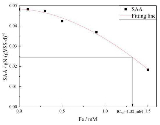 - The results of the kinetic fitting analysis showed that parameter K increased slightly from 8.77 to 8.93 at a low level of Fe (III) (lower than 0.1 mM) and decreased from 8.93 to 2.35 at a high level of Fe (III) (more than 0.1 mM), indicating that the lower concentrations of Fe (III) promote the anammox reaction, while higher concentrations of Fe (III) inhibited it. Additionally, the anammox reaction exhibited an IC50 of 1.32 mM for Fe (III) under the conditions investigated.