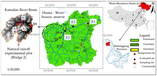 The investigation on environmental background values in China was first conducted in the 1990s. During this period, a large number of relative studies with a certain scale emerged, involving the Lijiang River, Songhua River, Xiangjiang River, Dongting Lake, Jialing River, etc. Most of the studies focused on heavy metals and soil sediments in water and yielded fruitful achievements [,,,,]. Recently, researchers have been paying more attention to the effects of human activities on the environment, while few report on the environmental background pollutant values in China. In 2018, an author enrolled in research on the surface water background values at the sources of rivers in northeastern China. Taking Heilongjiang Province as an example, it was found that the concentrations of chemical oxygen demand (COD), permanganate index (CODMn), and a high level of ammonia nitrogen (NH4-N) in the surface water affected the environmental background. These have significantly disturbed the water quality evaluation results in this river and its downstream [].