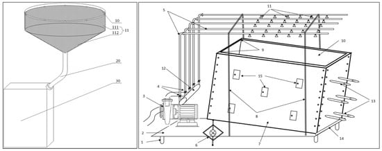 The device for the litter leaching solution is depicted in Figure 2 (left, patent authorized). It consists of a funnel filter with an upper cylinder (diameter 0.5 m, height 0.2 m) and a lower cone (height 0.3 m). The filter screen, which collaborates with the inner wall of the filter, forms a receiving cavity. The opening at the first end of the filter serves as the receiving cavity, and the bottom of the open end is connected to a guide pipe. The other end of the guide pipe is connected to a 2 L water collector, which collects the litter solution.