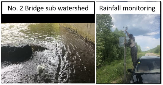 During the experiment, the water quality and quantity at the outlet of the Kamalan River Basin were monitored simultaneously. The water samples were collected in 1 L polyethylene bottles, dried, labeled and incubated. The flow velocity was measured using portable current meter (ls1206b/ls300-A, XinYe, Qingdao, China). The water crossing section was calculated based on the measured data of the Kamalan River and the water level. The location and environment of the NO. 2 Bridge sub-watershed can be seen in Figure 3.