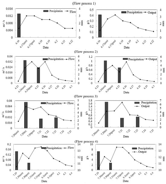 Four natural rainfall-runoff processes were observed in the No. 2 Bridge sub-watershed from June to August 2020. The outlet flow process and the concentration of COD are presented in Figure 4. The total rainfall amounts were 3.3 mm, 8.6 mm, 11.7 mm, and 24 mm, respectively. The calculated runoff coefficient ranged from 0.08 to 0.23, with an average of 0.12. According to ∫cqdt, the COD loads in the four processes of the No. 2 Bridge sub-watershed were 62.16 kg, 234.68 kg, 368.18 kg, and 1918.71 kg, respectively. The discharge time, peak time, and concentration curve exhibited variations under different rainfall conditions. Table 5 presents the values of CODMn and NH4-N. It is evident that the correlation coefficient between rainfall and the output of background pollutant load was greater than 0.9, indicating a strong response relationship with rainfall.