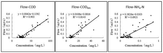 A strong correlation was observed between the background value and flow in the No. 2 Bridge sub-watershed (Figure 5). The main driving factor for the output of background pollutant load from a single non-point pollution source is rainfall runoff. There is a strong linear relationship between the concentration and flow of these pollutants. The source strength does not change significantly, indicating that the loss process of background pollutants is determined by rainfall runoff.
