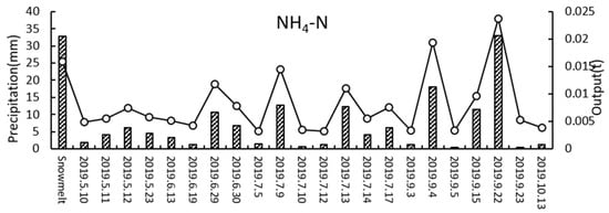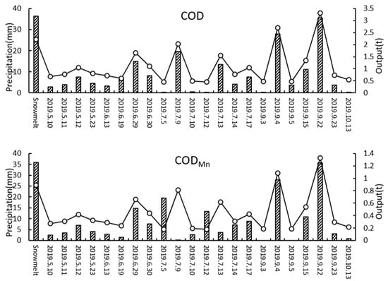 There was no significant impact from human activities on the underlying surface conditions in a short period of time. A positive correlation was found between runoff and non-point source pollution output []. The experiments conducted in the No. 2 Bridge sub-watershed showed a correlation coefficient greater than 0.9 between rainfall and background pollutant load output. By considering the rainfall data from the Bishui hydrological station in 2019 (shown in Figure 3), the estimated annual output of background pollutant load in the No. 2 Bridge sub-basin for 2019 is presented in Table 6 and Figure 6. The background pollutant outputs for COD, CODMn, and NH4-N in the No. 2 Bridge sub-watershed were 18.2 t, 7.7 t, and 0.11 t, respectively.