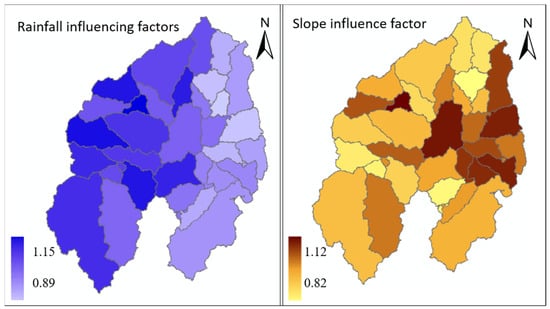 Distribution of influencing factors of rainfall and slope in 33 sub-basins of the Kamalan River.