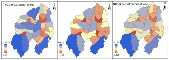According to the improved pollutant output coefficient model, the annual average fluxes of COD, CODMn and NH4-N in the Kamalan River Basin are 2338.7 t, 877 t, and 12.7 t, respectively. These distribution characteristics are depicted in Figure 8.