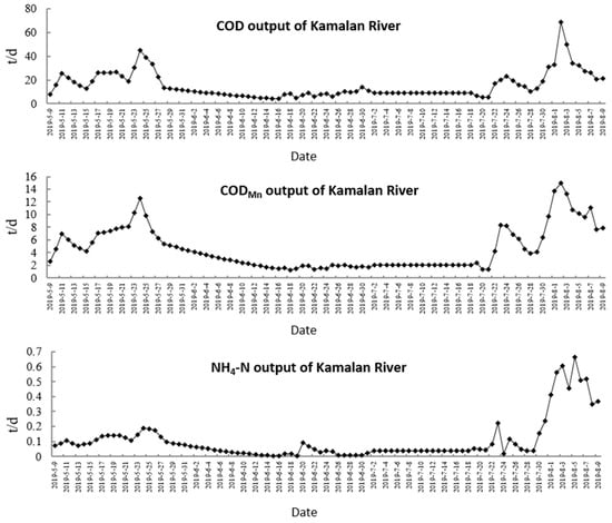 In this experiment, we monitored the water quality and quantity of the outlet section in the Kamalan River Basin. The monitoring periods were from 9 May to 28 May 2019, 16 June to 1 July 2019, and 19 July to 9 August 2019. For the dates when monitoring was not conducted, we interpolated the data. From 9 May to 9 August 2019, we observed the background pollutant output process at the control section of the Kamalan River, as shown in Figure 9. The total output of COD, CODMn, and NH4-N was 1412.7 t, 421.5 t, and 9.8 t, respectively.