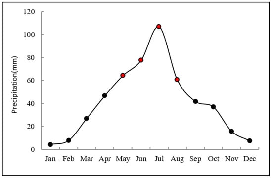 Despite the lack of synchronous monitoring data for the Kamalan River in other time periods of 2019, a clear correlation was shown between the runoff and the inflow of non-point source pollution into the river in the Kamalan River Basin. Therefore, based on the annual distribution characteristics of rainfall and the inflow of pollutants from 9 May to 9 August 2019, it was possible to estimate the amount of background pollutants in other times of the year. Figure 10 illustrates the annual distribution of multi-year average rainfall in the Kamalan River Basin, where the rainfall from 9 May to 9 August accounts for 49.9% of the total annual rainfall. Assuming a unique runoff coefficient for the entire Kamalan River Basin, and considering the relationship between runoff and non-point source pollution load, the estimated amounts of COD, CODMn, and NH4-N were 2825.5 t, 842.9 t, and 19.6 t, respectively.