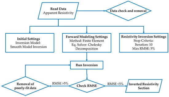 Furthermore, terrain variations are <1 m at this location. EarthImager 2D automatically chooses the finite element method for forward modeling when a terrain correction is completed. The default equation solver for the forward is Cholesky Decomposition, which the software manufacturer sets. We selected a maximum of ten iterations and a maximum RMSE of 5% as termination criteria for resistivity inversion settings. The inversion is continued until the RMSE is reduced below 5%. Figure 3 shows the data-processing workflow for this study. The resistivity scale for this study was set to the same scale (10–3500 Ω-m) for a consistent interpretation of the stratigraphic layers.
