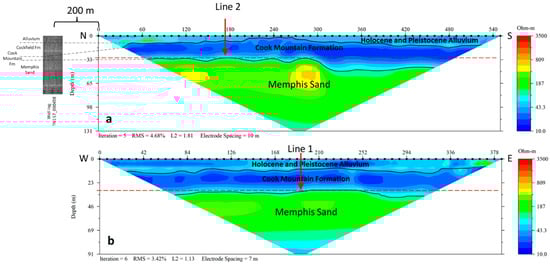 Figure 5a,b provides insights into the average depths of the layer boundaries between lithologic units. The average depth for the boundary between the Cook Mountain Formation and Memphis Sand is estimated at ~32 m for the 10 m spacing and ~32.5 m for the 7 m spacing survey, suggesting little or no apparent depth shift. The boundary depth between the Cook Mountain Formation and Memphis Sand, determined by the well log (TN157_000438) ~200 m north of GC line 1, is 32.5 m mbgs (meter below ground surface). Similarly, the depth of the base of the alluvium in both IRPs is ~8 m, which is similar to or a little deeper than that observed in the nearby borehole. The absence of a distinct shift may be related to very high resistivities or the absence of steel casing adjacent to the survey lines.