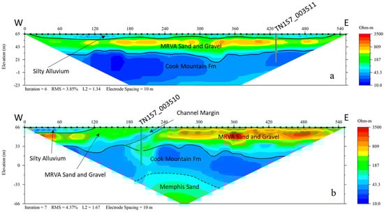 Line B is 1.25 km east of the Mississippi River and 255 m east of Line A. The IRP of Line B (Figure 6b) exhibits a moderate ERV zone of the silty alluvium to 120 m towards the east from the western side of the line. Below the intermediate ERV layer and along the remainder of the line to the east, a high ERV zone is observed between ~57 and ~14 masl, representing sand and gravel in the MRVA. A low-to-moderate ERV interval cuts across the high ERV zone from 240 to 170 m along the line. In borehole TN157_003510, this interval includes more silt and clay. The overall shape is consistent with a buried MR channel margin, similar to those inferred at the Tennessee Valley Authority (TVA) sites [14]. Like line A, the base of the high ERV zone has ~19 m of relief, with deepening of the contact to the east. Ref. [14] also noted the deepest level of incision of the MRVA in the underlying Eocene strata, which was deepest along the eastern side of the TVA sites. From ~34 masl to ~−40 masl, a low ERV layer underlies the MRVA that is represented by laminated-to-thinly-bedded silty clay and silty, very-fine-grained sand of the Cook Mountain Formation in borehole TN157_003510. The intermediate-to-high resistivity in the interval of ~26 to ~8 masl at the borehole site may represent finer sand in the upper part of the Cook Mountain Formation in that area. The intermediate-to-high ERV layer below the Cook Mountain Formation in the center of line B is the Memphis Sand, which is better resolved in line B than in line A.
