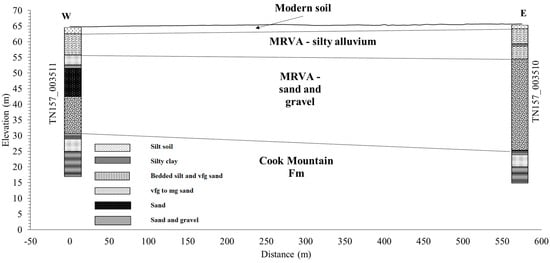 Line A is positioned ~730 m east of the river. A discontinuous layer with a moderate ERV range of ~50–110 Ω-m is present from 65 to 58 masl (meter above sea level) in Line A (Figure 6a). At 60–20 masl, a high ERV zone (>100 Ω-m) is observed, which connects to the surface at both ends of the survey line. Combining these two intervals forms the MRVA with the low-resistivity upper layer being the fine-grained, silty alluvium. At ~34 to 20 masl, a low ERV layer (<50 Ω-m) underlies the MRVA with ~14 m of relief along the contact. This unit extends to ~23 m masl or more. It is represented by laminated-to-thinly-bedded silty clay and silty, very-fine-grained sand of the Cook Mountain Formation in borehole TN157_003511 (Figure 7). The lower part of the IRP, below −23 masl, in Figure 6a had low-quality data removed from the profile and not shown but likely includes high-resistivity Memphis Sand strata.