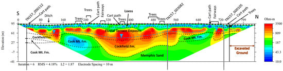 AP is situated in the heart of Memphis near the Sheahan well field, one of eleven Memphis’ Light Gas and Water municipal-well fields. Numerous studies have been conducted using geochemical tracer, hydrologic, and borehole data on the leakage of modern water into the Memphis aquifer near the Sheahan well field [32,57,58]. The water table elevation is 60 masl [59] at the AP site and is depressed relative to the water table elsewhere in the Memphis area, suggesting water leakage from the shallow aquifer to the Memphis aquifer [32]. Two boreholes with geologic and geophysical logs are aligned with the ER line (TN157_000105 and TN157_000112), and a cored borehole is shown (TN157_003082) 0.5 km west of the line (Figure 8).