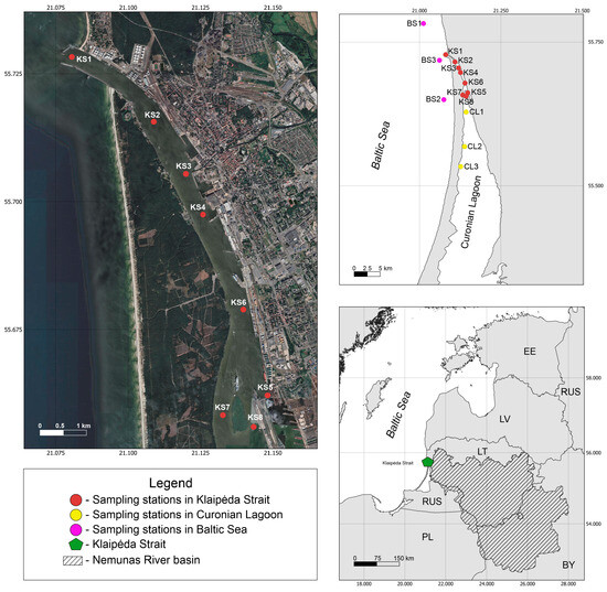 The area of this study includes the Lithuanian part of the Curonian Lagoon (CL), the Klaipėda Strait (KS), and the Baltic Sea nearshore (BS, Figure 1). The Curonian Lagoon is a shallow semi-enclosed freshwater lagoon separated from the Baltic Sea by the Curonian Spit [25]. The circulation of water in the Curonian Lagoon is primarily influenced by the discharge of the Nemunas River and the direction of the wind [26]. The movement of water from south to north occurs because of the Nemunas River’s flow and the differences in water levels between the lagoon and the sea, and this current extends from the Nemunas Delta to the Klaipėda Strait [27]. Approximately 22 km3 of fresh water enters the lagoon each year as river runoff [28]. Moreover, the Nemunas River transports around 342,000 metric t of particulate matter into the lagoon through its tributaries [29]. The southern and central parts of the Curonian Lagoon are freshwater (<0.5 psu), while the northern part is oligohaline with irregular salinity (from 0 to 8 psu) fluctuations [25]. The northern part of the Curonian Lagoon connects the lagoon with the Baltic Sea through the Klaipėda Strait, which is characterized by a large technogenic and anthropogenic load [29,30,31].