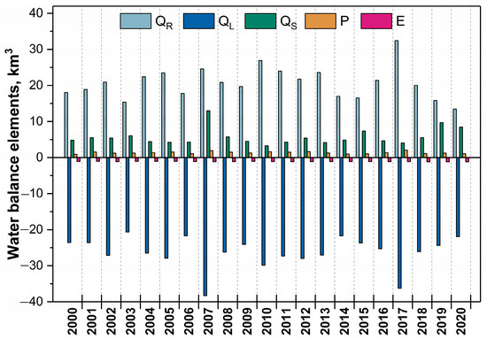 Changes in the water balance components of the Curonian Lagoon in the period of 2001–2020. Here, QR—river inflow, QS—inflow from the sea, P—precipitation, QL—outflow from the lagoon; E—evaporation.