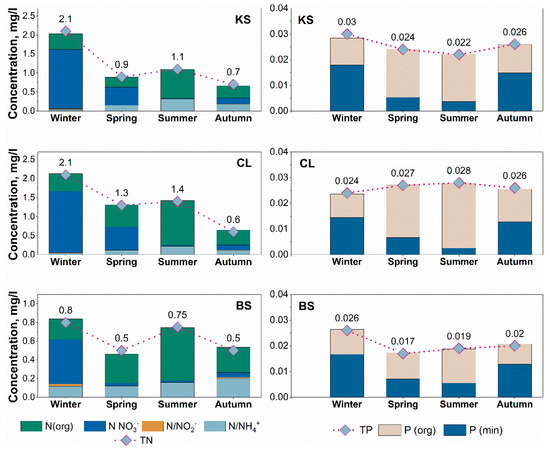 Usually, the highest concentrations of TN are observed during the cold period when the low ambient temperature would limit production. The dominant form of nitrogen in the water column is mineral nitrogen (N/NH4+; N/NO3−; N/NO2−), primarily nitrates (N/NO3−). During the period 2018–2020, the average nitrate concentrations in the winter season were 1.62 mg/L, 1.55 mg/L, and 0.47 mg/L in CL, KS, and BS, respectively. The maximum N/NO3− value, reaching 2.97 mg/L, was recorded in the CS. In a previous study, even higher N/NO3− concentrations (up to 8.6 mg/L) were found [15].