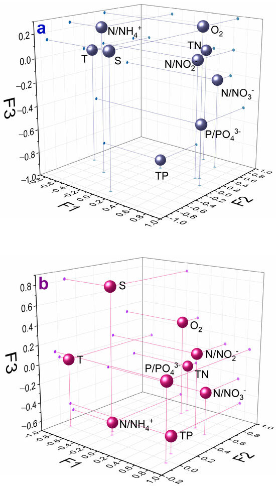 In the examination of the coastal water column in the Baltic Sea, the PCA analysis also produced three factors (Figure 4b) that accounted for variances of 30%, 24%, and 17%, respectively. The first factor (F1) exhibited notable positive loadings for phosphates, nitrates, TP, and dissolved oxygen, as well as negative loadings for temperature. Just like in the case of Curonian Lagoon, F1 indicates the influence of seasonal environmental changes.