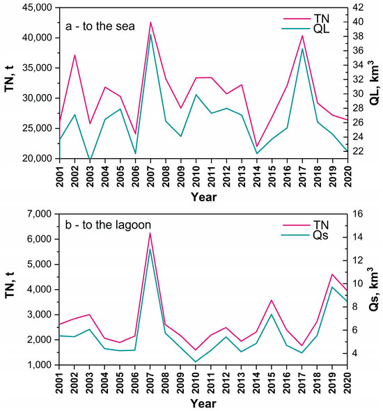 The average annual TN amount (t) and the annual inflow (km3) entering (a) the Baltic Sea and (b) the Curonian Lagoon. Here, TN—total nitrogen; QL—outflow from the Curonian Lagoon to the Baltic Sea; Qs—inflow from the Baltic Sea to the Curonian Lagoon.