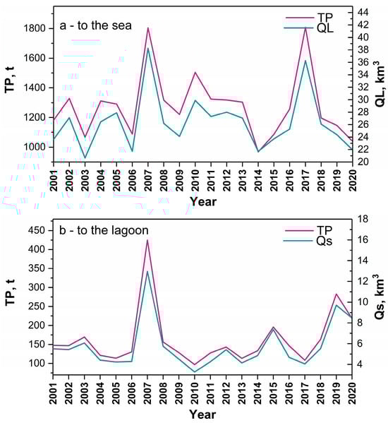 The average annual TP amount (t) and the annual inflow (km3) entering (a) the Baltic Sea and (b) the Curonian Lagoon. Here, TP—total phosphorus; QL—outflow from the Curonian Lagoon to the Baltic Sea; Qs—inflow from the Baltic Sea to the Curonian Lagoon.