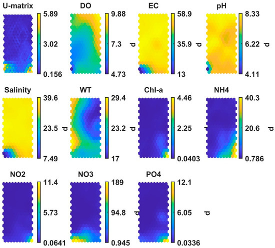 The SOM’s output space is visualized by using a unified distance matrix (U-Matrix). The U-Matrix calculates distances between neighboring map units (neurons) [40]. The SOM’s Component Planes (CPs) are an important visual feature of the SOM and are defined as the values of a single vector component in all map units [43].