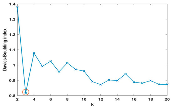 Calculation of the optimal number of clusters based on the minimization for the Davies–Bouldin index when the SOM is clustered using the k-means algorithm. The minimum number of the Davies–Boulding index (k = 3) is indicated in a red circle.