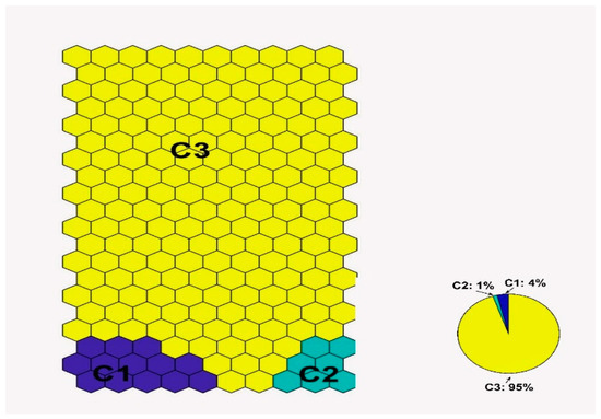 Clustering of the SOM based on the k-means algorithm (where Cluster 1: C1 is symbolized with blue, Cluster 2: C2 is symbolized with green, and Cluster 3: C3 is symbolized with yellow). The pie chart is presenting the percentage of SOM’s samples for each cluster.