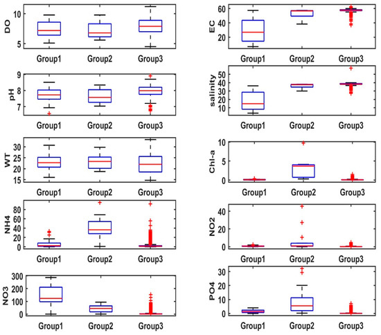 Boxplot graphical representation of the SOM’s groups/clusters (Group 1, Group 2, Group 3) derived from the k-means algorithm for each input environmental parameter (where the red horizontal line denotes the group’s median value; the blue box gives the 25–75% percentile range; the whiskers give the valid range; and red marks are associated with extreme values/outliers).