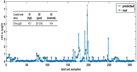 ANN’s predicted values for Chlorophyll-a (Chl-a) levels regarding the test set data vs. the real Chl-a measurements, where the blue line is associated with the real data and the red line is associated with the predicted data. The embedded table is describing the Cypriot coastal water status for different Chl-a concentrations (where S1: high, S2: good, and S3: moderate).