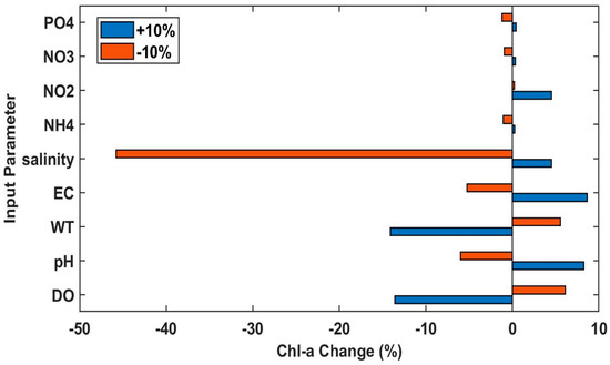 Sensitivity analysis was performed to evaluate the input parameters’ impact on the modeled Chl-a parameter. For that reason, the input parameters were increased (perturbed) based on the perturbation sensitivity analysis algorithm by +10%, and similarly decreased by 10%. The results of the sensitivity analysis are graphically illustrated in Figure 7. In the case of +10% increase in the input parameters, it was calculated that the nutrients (i.e., PO43−, NO2−, NH4+, and NO3−) have a positive relationship with the Chl-a production mechanism. In addition, pH, EC, and salinity are positively related to the Chl-a parameter, while WT and DO have a negative relationship with the algal production. In the case of −10% decrease in the input parameters, it was calculated that the Chl-a levels are decreased for PO43−, NO3−, NH4+, salinity, EC, and pH, while the Chl-a levels are increased for NO2−, WT, and DO. The salinity (when negatively perturbated) and the WT (when positively perturbated) parameters are the most influential on Chl-a production.