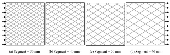 DFN models of different Lseg: (a) 30 mm; (b) 40 mm; (c) 50 mm; (d) 60 mm. Note: The arrows represent the inflow and outflow of fluid.