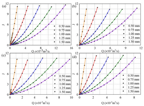 Effect of hydraulic gradient on flow rate under different fracture apertures and fracture segment lengths: (a) Lseg = 30 mm; (b) Lseg = 40 mm; (c) Lseg = 50 mm; (d) Lseg = 60 mm.