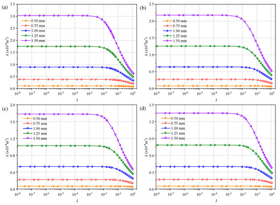 When a small hydraulic gradient is applied to the DFN models, permeability k is constant, which indicates that the fluid flow conforms to laminar flow, ; the permeability is not correlated with the hydraulic gradient; and the flow rate can be calculated using the cubic law. As the hydraulic gradient increases, a nonlinear fluid flow appears, the flow rate does not linearly increase with the increase in hydraulic gradient, and the permeability k decreases gradually. Forchheimer’s equation needs to be considered to compute the fluid flow through DFN models. Figure 5 shows the effect of the hydraulic gradient in the range from 10−8 to 100 on the permeability k with different fracture apertures and fracture segment lengths. Taking the fracture aperture equal to 1.5 mm in Figure 5a as an example, when , k is a constant and the fluid conforms to a laminar flow; when , k dramatically decreases with increasing hydraulic gradient and a nonlinear fluid flow is predominant; when , k slowly decreases with increasing hydraulic gradient and a nonlinear fluid flow begins to appear.