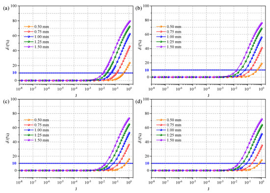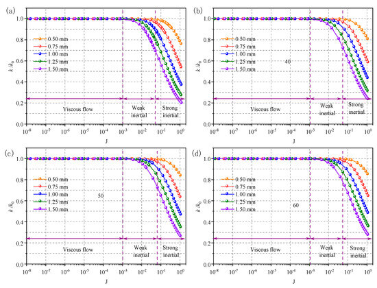 Figure 7 shows the effect of the hydraulic gradient on permeability deviation under different fracture apertures and segment lengths. The permeability deviation increases with increasing hydraulic gradient. When the hydraulic gradient is below 10−3, the various fracture apertures and segment lengths have no effect on the permeability deviation and , which agrees with the conclusion obtained in the previous section. With increasing to larger than 10−3, the fluid flow is in a nonlinear regime, a deviation in permeability appears, and increases with the increase in .