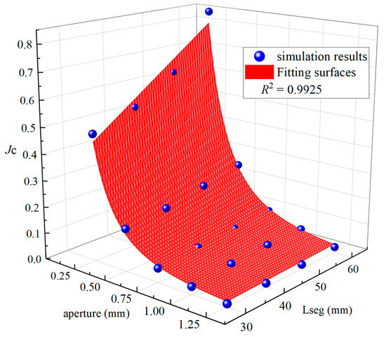 Figure 8 summarizes the relationship between fracture aperture, segment length, and critical hydraulic gradient . With the increases in fracture aperture, the critical hydraulic gradient decreases following a power pattern. In contrast, the critical hydraulic gradient increased linearly as the fracture segment length increased. The prediction model of hydraulic gradient involved with fracture aperture and fracture segment length is constructed using multiple regression algorithms based on the results of dynamic analyses: