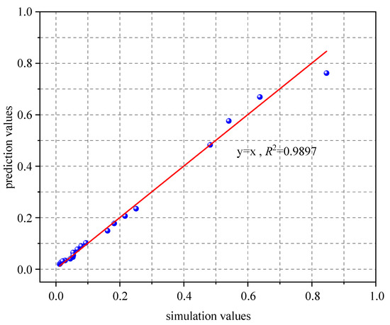 The values of calculated through numerical simulation and prediction using Equation (14) are listed in Table 1. In addition, the simulation values and prediction values are taken as horizontal and vertical coordinates, respectively. The data in Table 1 are plotted in Figure 9 and fitted with y = x. The correlation coefficients are greater than 0.98, indicating that the prediction in Equation (12) is reliable.