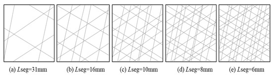Figure 1 shows the model with fracture segment lengths (Lseg) from 30 mm to 60 mm with a gradient of 10 mm, and this interval covers most of the distribution of fracture segments in fractured rock [32,33]. These models have a size of 200 mm × 200 mm. Conventionally, the mechanical aperture of fractures and faults is usually in the range of 0.1 to 10 mm. The number of meshes exponentially increases with decreasing fracture aperture in a fixed discrete fracture network, which would greatly increase the difficulty of geometric discretization and fluid dynamic computation. In addition, fractures with a small aperture typically have small Re and flow rates, and the nonlinear characteristic would diminish with a small aperture. Considering the above, a fracture aperture from 0.5 mm to 1.5 mm with a gradient of 0.25 mm was selected and assigned to each fracture in the DFN models. In total, 20 DFN models (four types of fracture distance × five types of fracture aperture) were quantitatively analyzed.