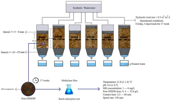 Although the utilization of OPEFBF for the removal of contaminants from wastewater through filtration processes has been reported in the literature, there remains a significant knowledge gap regarding the influence of fiber size and filter bed height on the efficacy of contaminant removal. Furthermore, limited attention has been given to investigating the potential for reusing OPEFBF as a post-adsorbent material. Thus, this study aims to address these research gaps by systematically evaluating the impact of both fiber size and filter-bed height on the removal efficiency of organic matter and nutrients (N, P) from synthetic domestic wastewater. Additionally, the adsorption capacity of OPEFBF (saturated) for MB will be assessed after the adsorption processes.