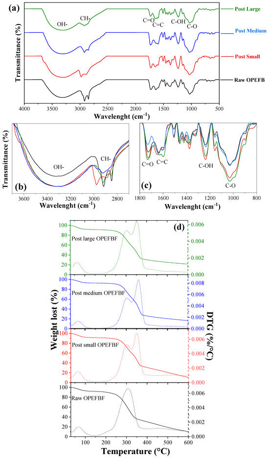 FTIR spectra and TGA of raw/post OPEFBF. (a) FTIR spectra between 500 and 4000 nm, (b) FTIR spectra: zone expansion 3700–2700 cm−1, (c) FTIR spectra: zone expansion 1800–800 cm−1, (d) TGA of raw/post OPEFBF (TGA = solid line, DTGA = dotted line).