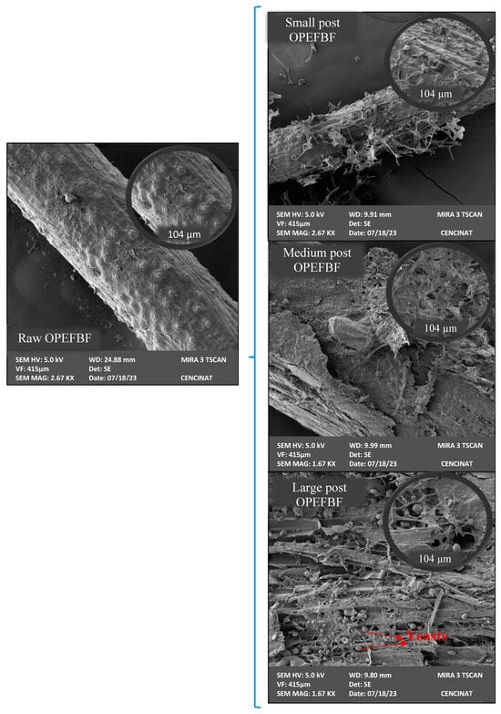 Figure 3 demonstrates that the raw OPEFBF possess an irregular surface, accompanied by low cavities and pores. This was confirmed by the BET analysis result, which indicates a low surface area (0.47 m2/g). Meanwhile the SEM images from the post OPEFBF showed morphological changes and the presence of microorganisms. The small post OPEFBF shows the presence of biofilm with few yeasts, without major damage to the surface of the fiber, which suggests that the biofilm acts as protection for OPEFBF. As the particle size increases, a greater number of yeasts and greater effects on the surface of the fiber (greater porosity and cavities) are observed. The post large OPEFBF were the ones that presented the greatest morphological changes; the yeasts were even located within these irregularities and this is associated with the advantages that this particle size would have for these unicellular fungi [42]. Therefore, the chemical (functional groups) and irregular surface characteristics of raw/post OPEFBF suggest that they may have good adsorbent properties.